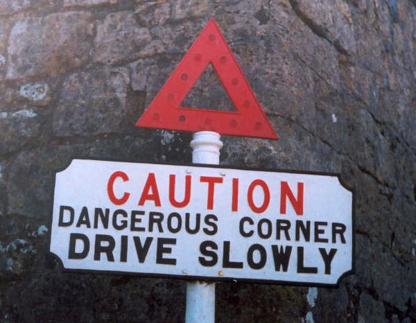 - "Dangerous Corner" sign at Carisbrooke Castle taken by Ray Harrington and used with permission.