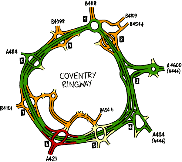 This map shows the route of the Ring Road, not perfectly to scale but accurately enough to demonstrate the size of its junctions in comparison to the spaces between them. It also includes a couple of roads inside the ring to demonstrate just how tightly the road is drawn around the city centre.