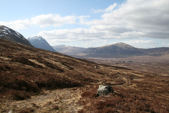 As the route starts to drop back down towards Telford's road, the views into Glencoe seem quite desolate, so the sight of the Kingshouse Hotel (reputedly the oldest Inn in Scotland) is very welcome! Shortly after rejoining the WHW, the route becomes public road at Blackrock Cottage, before crossing the modern A82.