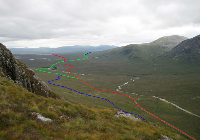 The Military Road (blue) runs higher up the hillside than the other routes. Click to enlarge
