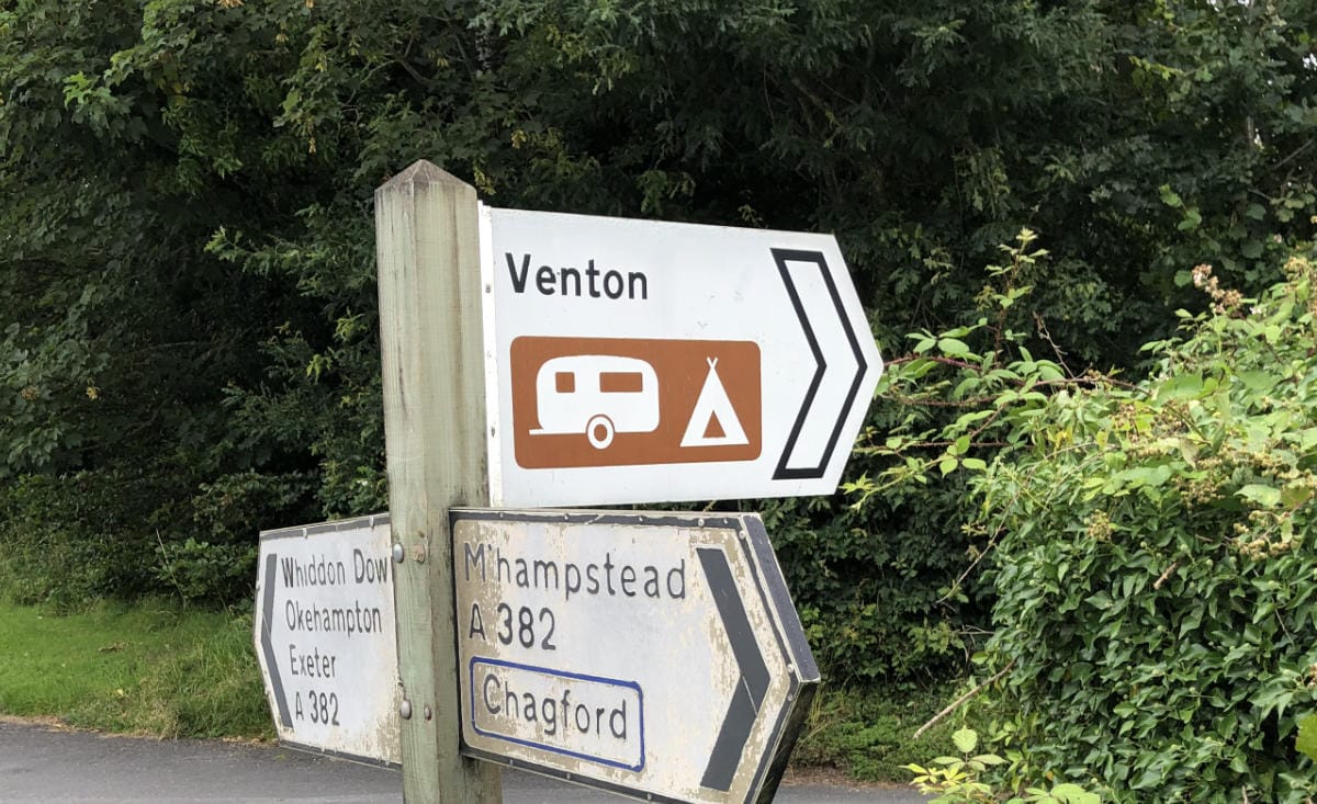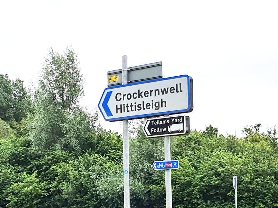 You can see, for example, a blue border around Chagford on this fingerpost, because the road it points down is suitable for all traffic, but if you keep following signs to Chagford you'll eventually be directed along a road that's recommended only for medium sized vehicles.