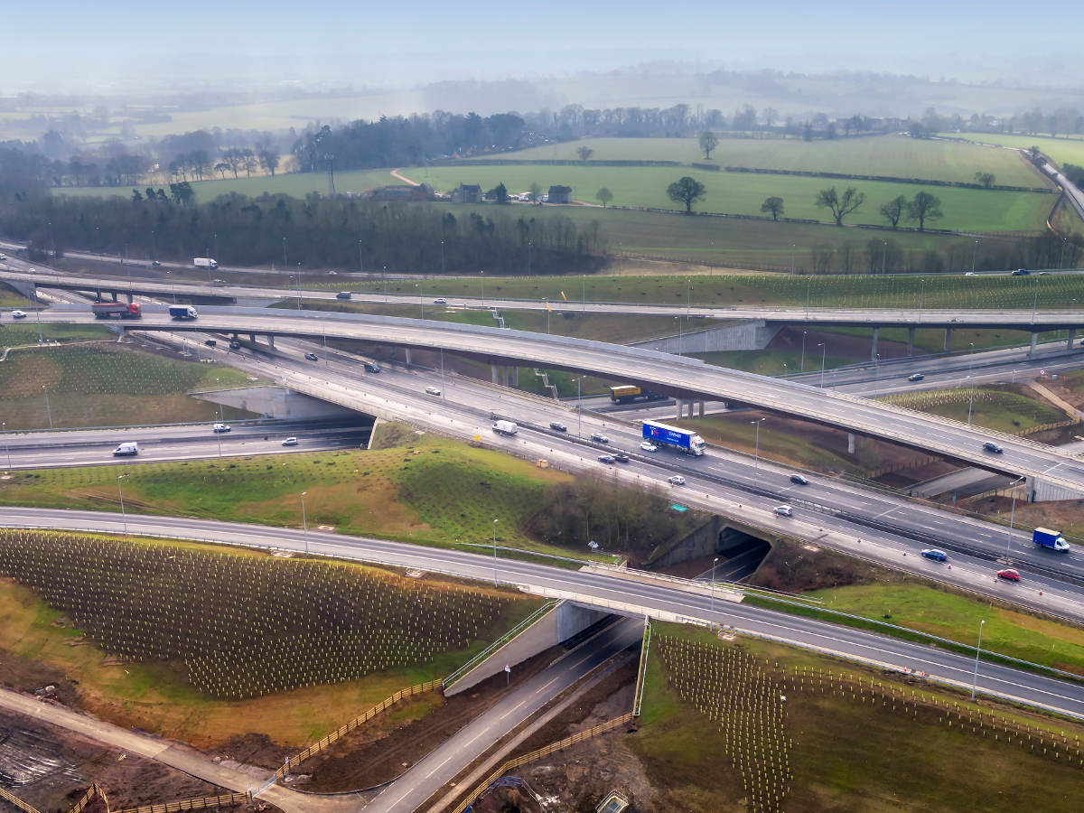 - Aerial view of M1 junction 19 (Catthorpe junction) and surrounding area cropped and scaled from an original by Highways England and used under this Creative Commons licence.