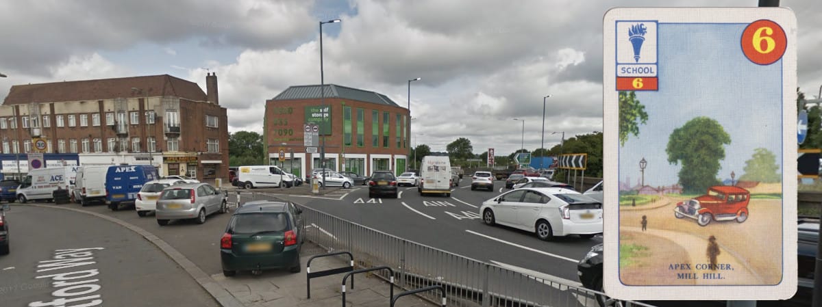Belisha also pays a visit to Apex Corner, the junction of A1 and A41 in Mill Hill. Now a grim signalised roundabout, there’s considerably more traffic in the way of a right turn towards the north.