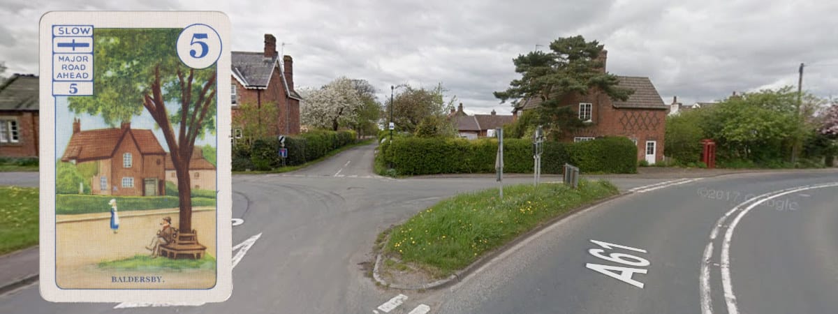 The Pack Horse Bridge at Sutton was a bit of a detour to see a historic landmark, but this diversion is positively inexplicable. Leaving the Great North Road to take in a length of the A61 in North Yorkshire, we have come to a stop in Baldersby, a nice enough little village, where the sight we’ve come to see is a small triangular green with a tree in the middle. The tree and peaceful bench are gone, replaced with a cluster of road signs, but the green is still there, and so is the little house with its diamond pattern brickwork.