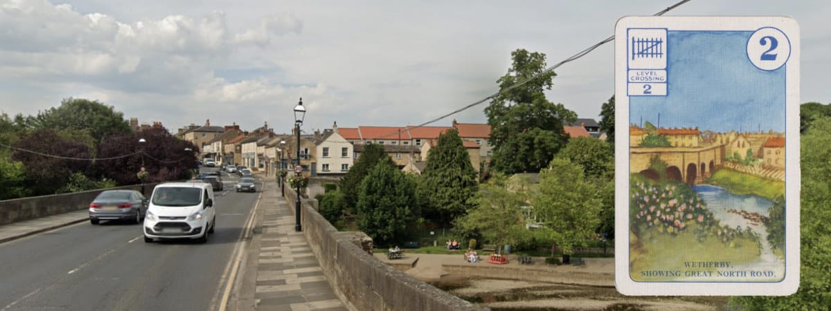Entirely recognisable, by way of contrast, is this view of Wetherby, which is almost unchanged except for some intrusive vegetation. There’s been a bridge here, carrying the Great North Road, since the 13th century, but the current one dates from a partial reconstruction in the early 1800s. The A1 left town in the 1950s which means this is now a local road, but no less handsome for it.