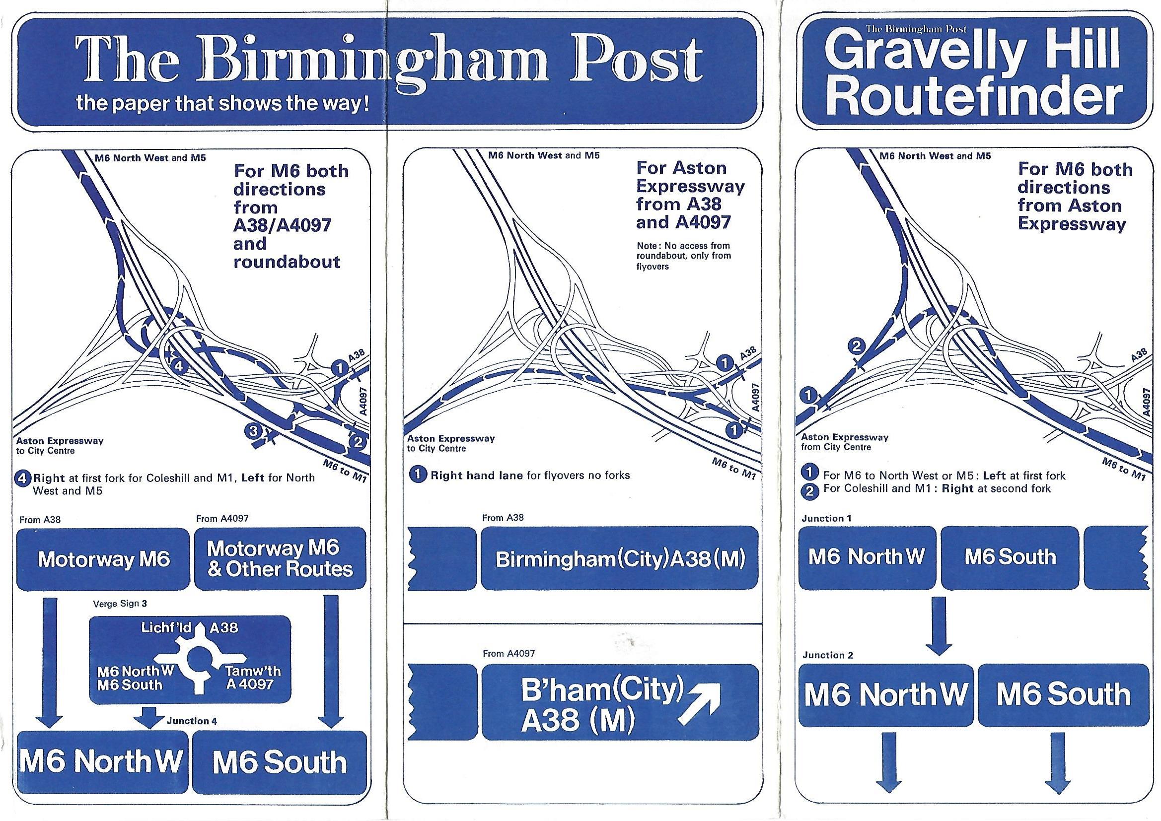 A rival paper may have named it, but the Birmingham Post were not going to be left standing when it opened. They leapt to the assistance of their bemused readers, providing a free pull-out guide to the new junction, printed on A4 card that folded up like a leaflet. You could keep it in the car and refer to it when planning journeys. Its six sides explained how to get from one arm of the junction to another, with maps of the sliproads you'd take and diagrams of each sign.