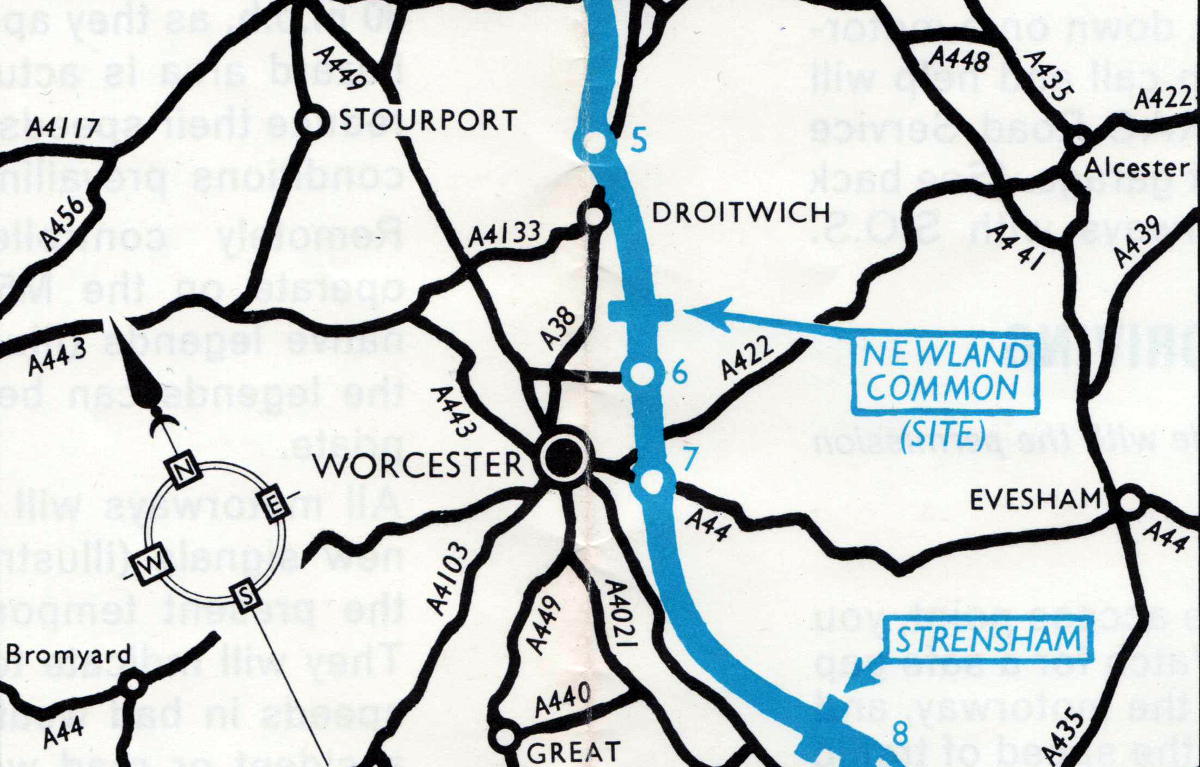 Where is it? It's 28 miles from Frankley to the next services on the M5 at Strensham. Halfway between them, just where you'd expect to find it, is the site for Newland Common. It was also sometimes known as Droitwich Services.