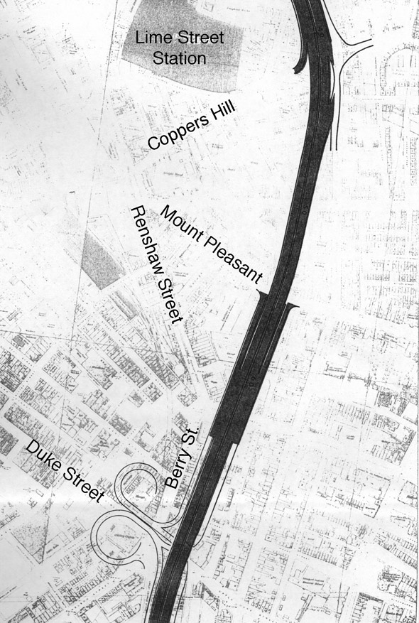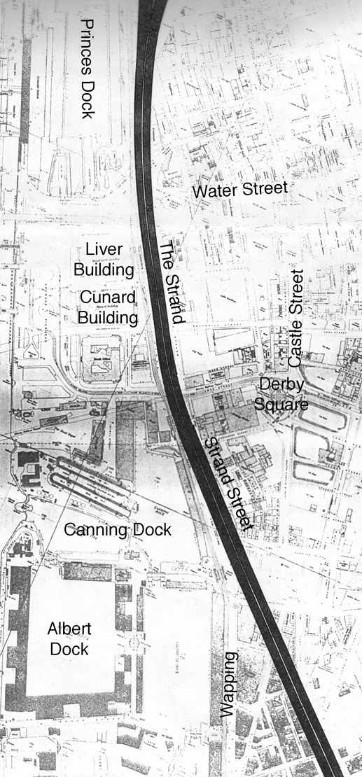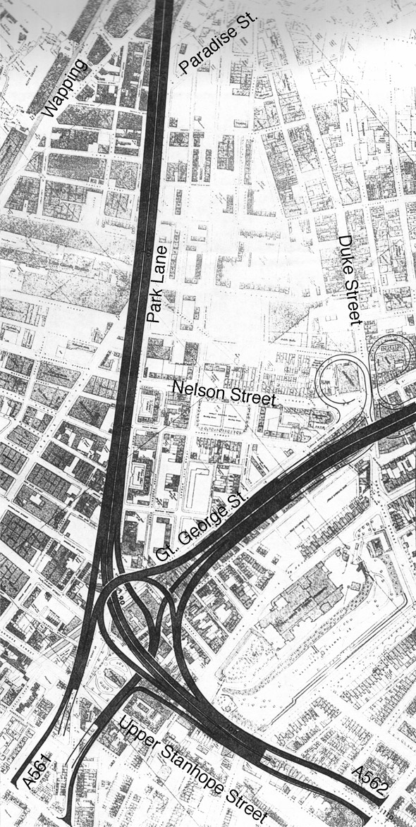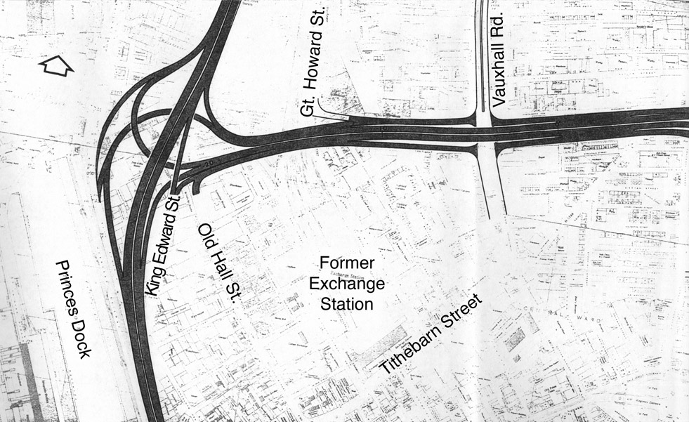 An extremely short motorway journey is possible from Great Howard Street to Vauxhall Road here, perhaps to do with the fact that Exchange Station was planned to become a large car park at the time.