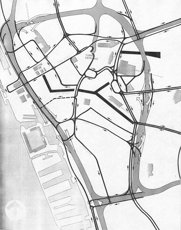 A second report, Shankland Report No. 11, is concerned with car parking in the city*. It shows intended locations for development of inner city car parking facilities, details access points from the LIM, and also shows a diagram with what appears to be an alternative layout. This layout does not appear in the first report, even though both were published in 1962. It shows a southern section of the LIM, separating the St James Interchange into two three-way junctions. However, this simply shows the land area for the motorway and not the revised layout. Most importantly, this report reveals that the LIM was intended to have free-flowing sliproads into multi-storey car parks at a number of (undisclosed) locations.