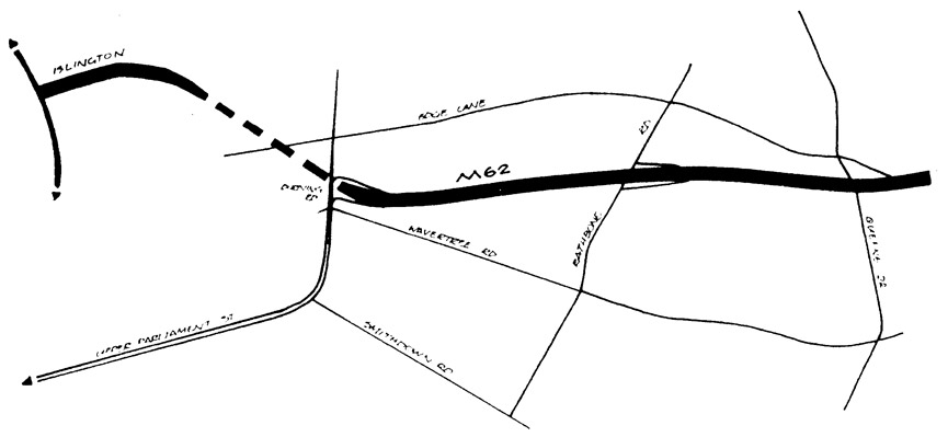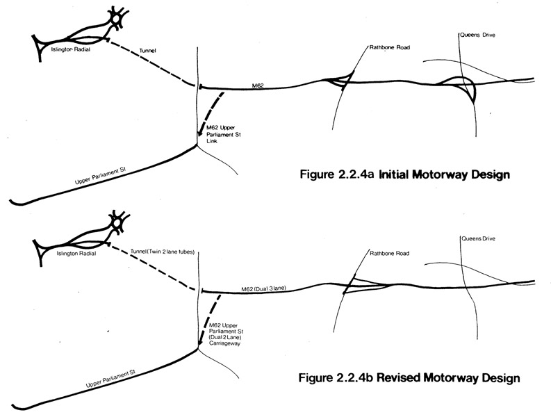 Had it been built, this would have provided an interesting anomoly on the motorway network. The M62 drops a lane prematurely at either Queens Drive or Rathbone Road, then drops another lane at Durning Road, allowing a two lane single-carriageway tunnel to Islington. This would have cost far less but had serious safety and capacity concerns - as well as having a trunk road motorway reduced to single carriageway.