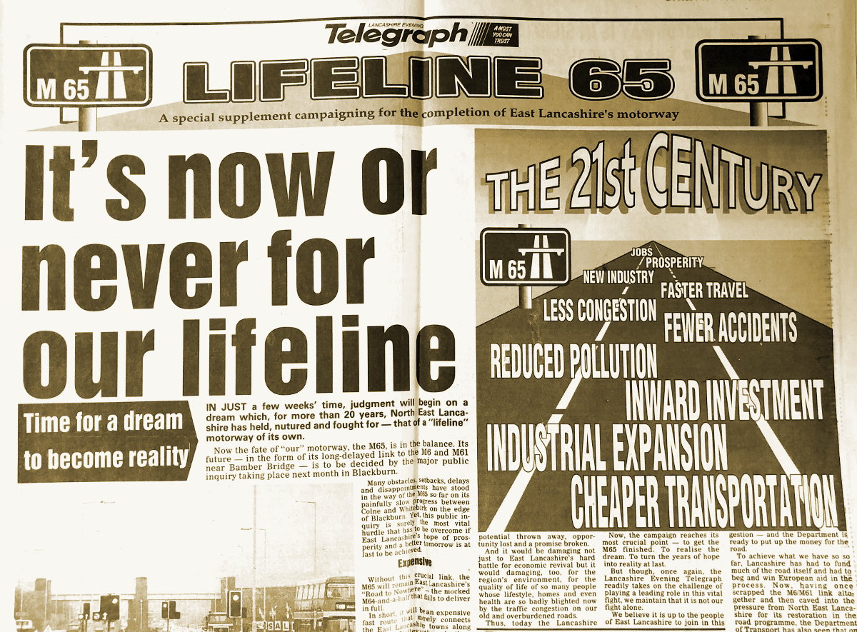 It took a decade for the project to get under way, partly because it was the first to be subjected to a new method of public involvement in the design process. The first section of brand-new M65 opened in 1981 near Burnley, and through the decade another four short lengths were completed, creating a strange route from Blackburn to Colne that locals called the "road to nowhere". Its aim was to connect North East Lancashire to the wider world, kick-start its regeneration and bring prosperity to a struggling region, but in its unfinished state it did none of those things.