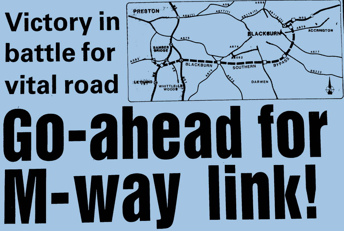 - "Go-ahead for M-way link!" was published in the Lancashire Evening Telegraph, cutting undated, 1988.