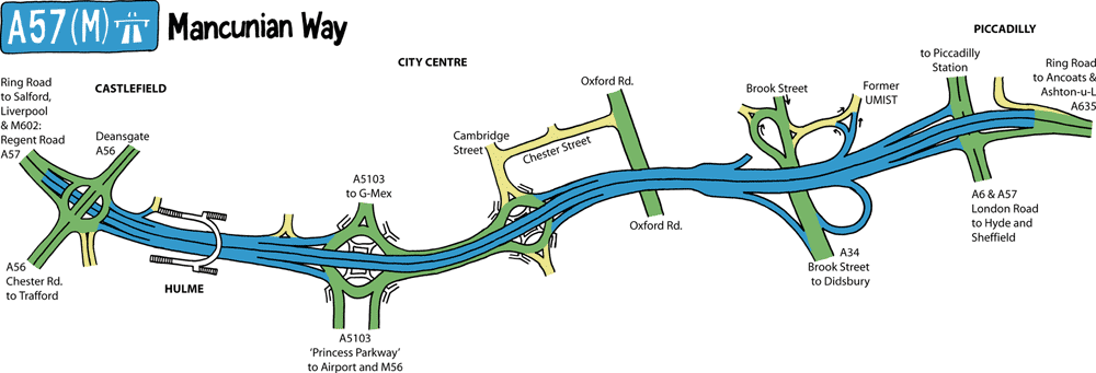 In the other direction, the A57 dual carriageway runs below the Mancunian Way to the next roundabout, curving away into the distance.