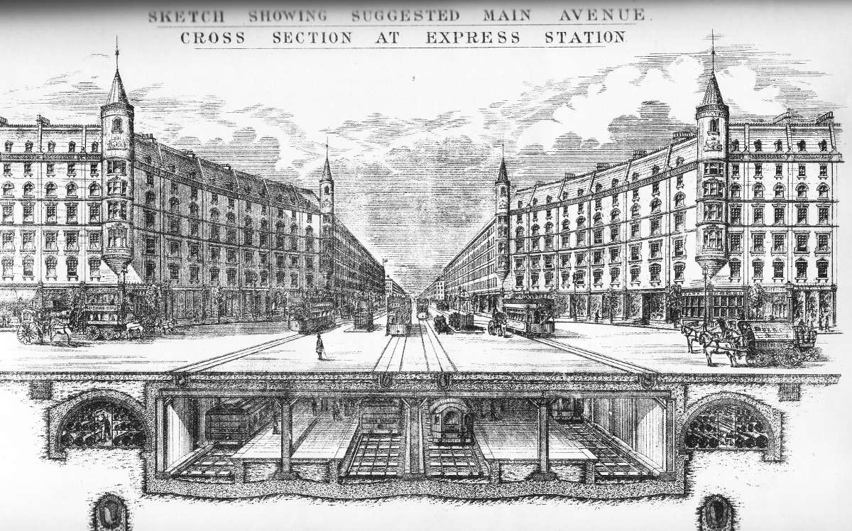 The Commission's core proposal was for two major "avenues" that would quarter London's central area. An east-west avenue would link Bayswater with Whitechapel via the City, while a north-south route would link Holloway to Elephant and Castle. Both would carry trams and four-track underground railways would run beneath.
