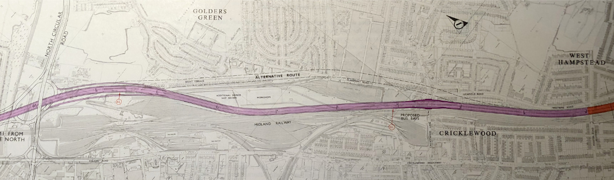 In comparison with the Hendon Urban Motorway - or indeed any of the other Ringways-era motorway plans for inner London - it looked almost virtuously non-destructive. But things weren't quite so simple. Travers-Morgan's plans showed a second alignment, running further east, between Hendon and Cricklewood.