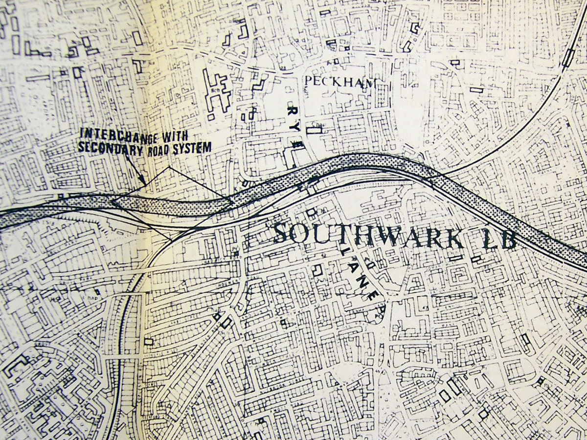 Peckham was the first of the locations where a major town centre redevelopment plan was being drawn up, which would have seen the whole area cleared and reconstructed in 1960s style with high-rise towers and busy roads everywhere. The motorway was to take full advantage of this, ploughing through what is now Peckham town centre and interchanging with whatever new relief roads were being planned for the area.