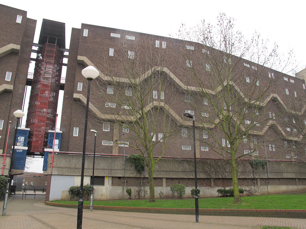 It's called the Barrier Block, an inviting nickname for a housing development if ever there was one (its official name is Southwyck House, though it rarely gets called that), and is known as a local eyesore. Its purpose was to save the Somerleyton Estate, which stands south of the building, from the noise and disruption of the motorway. It is very long and taller than you might expect, and its north-facing wall has only occasional, tiny windows because it was expected to face the motorway.