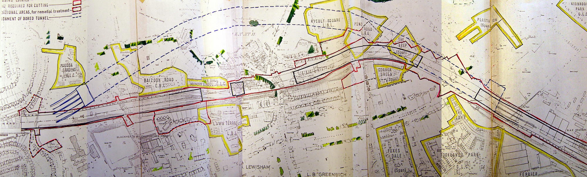 - Plans of tunnel alignment at Blackheath and alternative motorway line at Peckham Rye are from ACC/3499/EH/08/04/019.