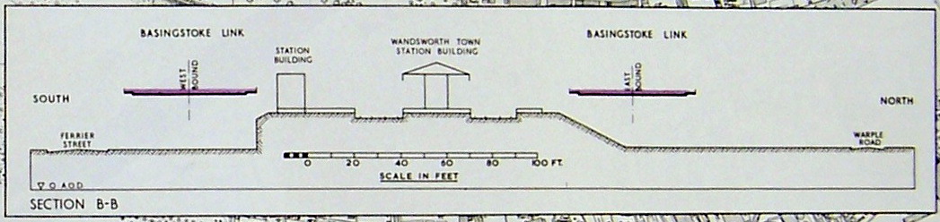 - Change of alignment to south side of railway by 1969; layout of Wandsworth Bridge Southern Approach; flyover designed to span C-W Link as well as railway: MT 118/379.