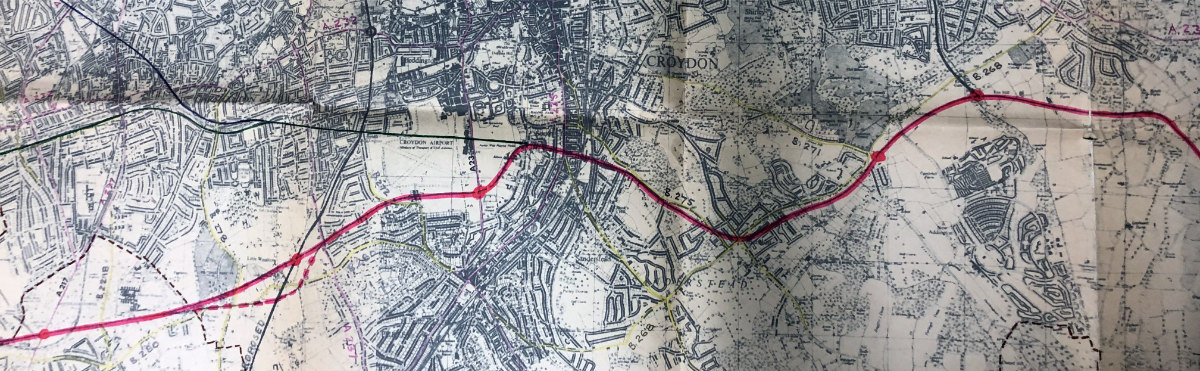 The next section would cut an arbitrary line through pleasant suburbs, crossing Riddlesdown Road, the Brighton Main Line railway and the A235 Brighton Road to reach an interchange with the A23 Purley Way. A curve to the west would lead to another destructive cut through South Beddington to reach a major interchange with the M23 at Woodcote Green.