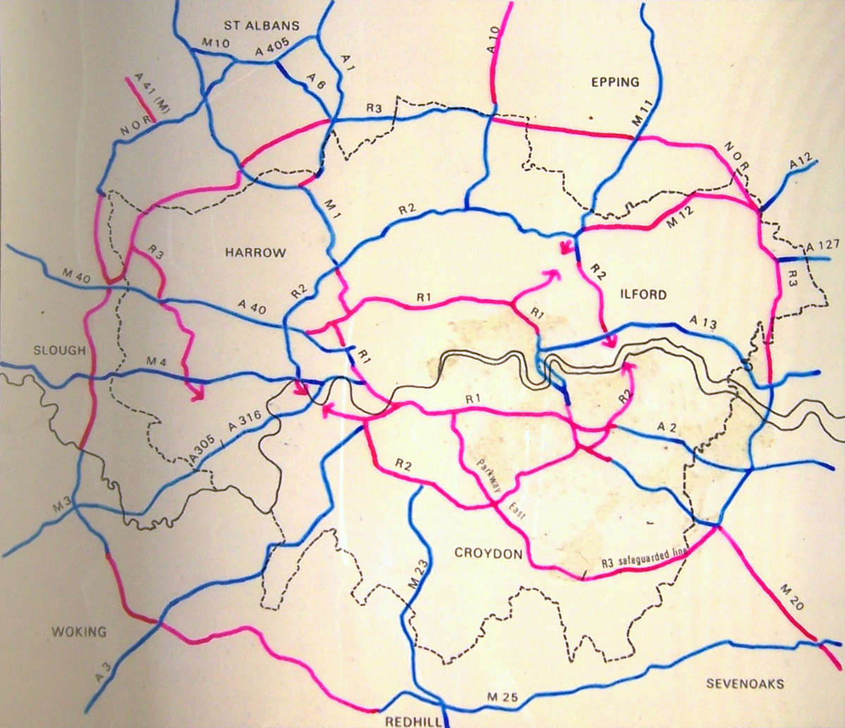Sutton's final argument was that the GLDP declared the South Orbital Road "less urgent than the establishment of the primary road network including Ringway 3", but in attempting to make this its official policy, the GLC was entirely divorced from reality. The South Orbital Road - now the M25 through Surrey - was about to start construction. With bulldozers moving in on that project, a line fixed for Ringway 2's Southern Section to the north, and Ringway 3 barely a twinkle in the planner's eye, how could it possibly go in the plan?