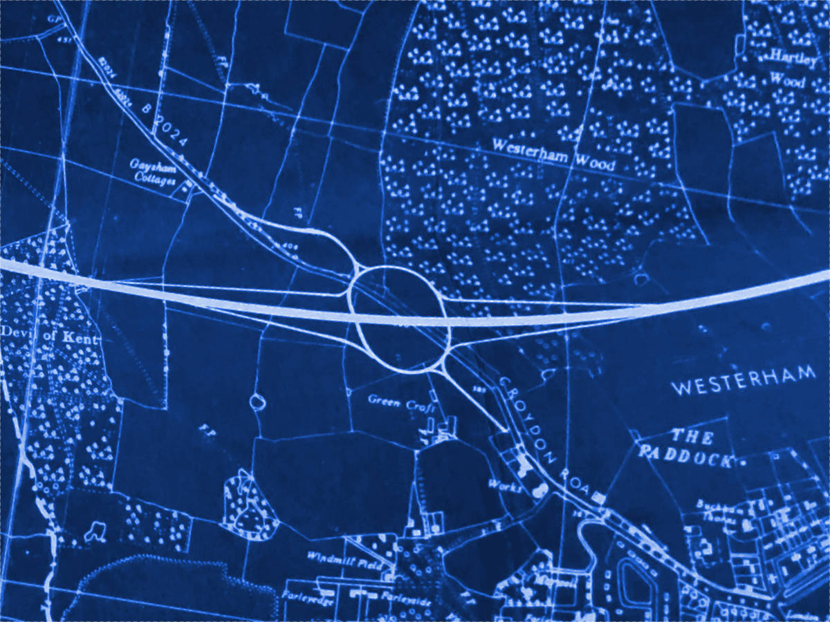 The route then follows the line of the modern M25, with only minimal differences to the motorway that was eventually built. The most noticeable change is that an additional junction was proposed at Westerham, connecting to the B2024 Croydon Road; its layout suggests extra connections were possible leading south towards the A25 and east towards the A233.