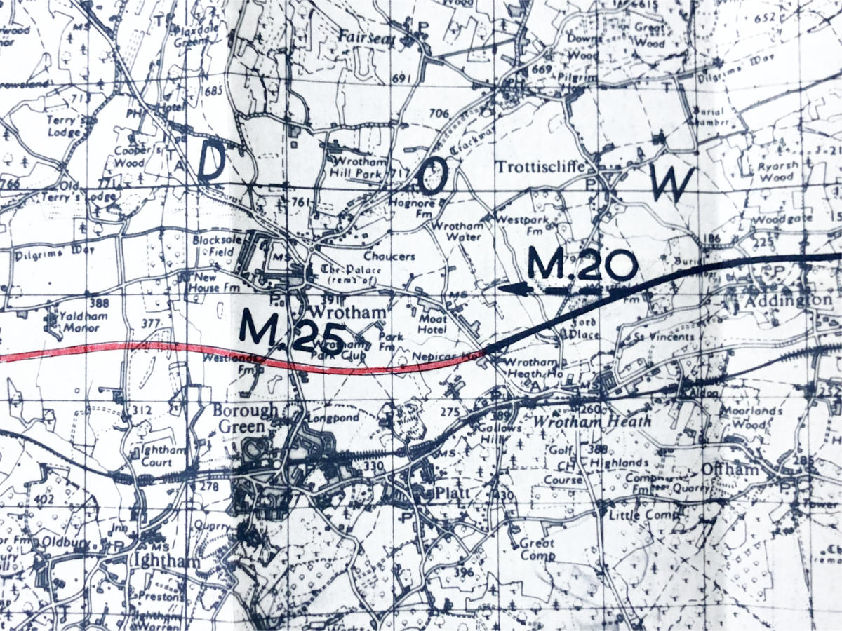 Very little of the South Orbital motorway plans from the 1960s were changed when the LOOR lumbered into view, but one or two things did. One was the invention of the M26. As originally planned, the M25 would have continued east from Sevenoaks to meet the M20 Ditton Bypass near Wrotham. Now that the motorway would turn north to meet Ringway 3's Dartford crossing, the orphaned length was granted a new number, becoming the M26 Wrotham Spur.