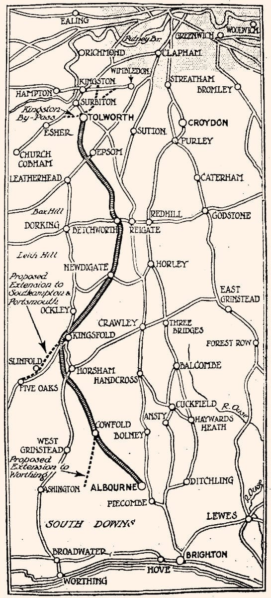 Another private plan arose in the 1920s, from the brand new Kingston Bypass to the fringes of Brighton, complete with a tunnel at Balcombe, and survived several years before it too faltered from lack of official support.