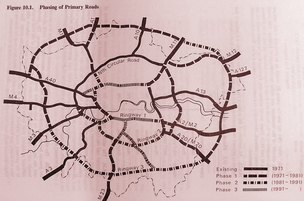 - Abercrombie proposal for Radial Route 9: p73, Greater London Plan (1944), Patrick Abercrombie, University of London Press.