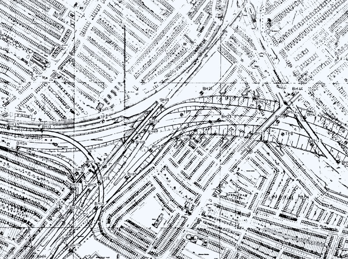 - Layout of Streatham Vale Interchange; route, Streatham Vale-Hooley: Engineering plans of M23 produced by George Wimpey Ltd for borehole drilling contract, held in private collection