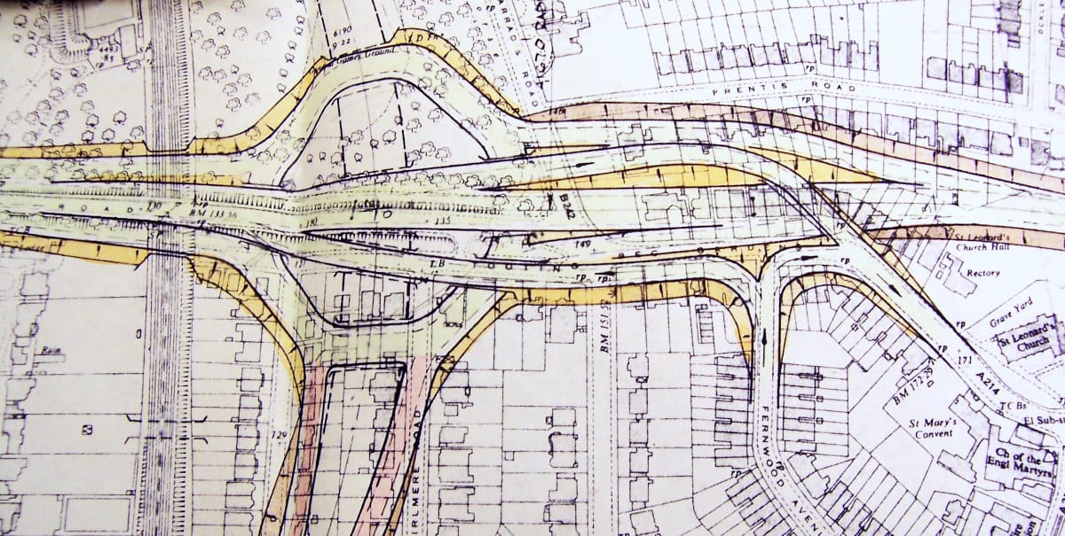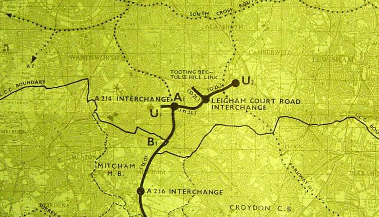 Travers Morgan's "new road" was the Tulse Hill Link, a two-lane expressway from the A214 at Tooting Bec Common to the A205 South Circular Road in Tulse Hill. It would disperse traffic from the M23 to surrounding roads, though it was only expected to be temporary until the M23 was pushed further north. As temporary measures go it was a magnificently expensive and destructive one.