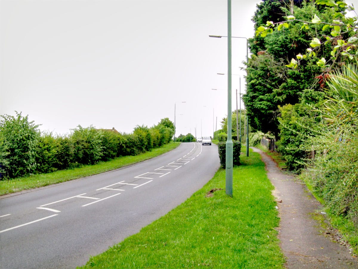 Crossing Tharp Road and taking the corner of Mellows Park, the motorway would then join the east side of Sandy Lane, still in cutting, requiring the demolition of large detached houses. It would turn south west, staying parallel to Sandy Lane South, but now running through the long back gardens between the houses on the south side of the road. The large houses would remain, but would have short gardens overlooking the motorway.
