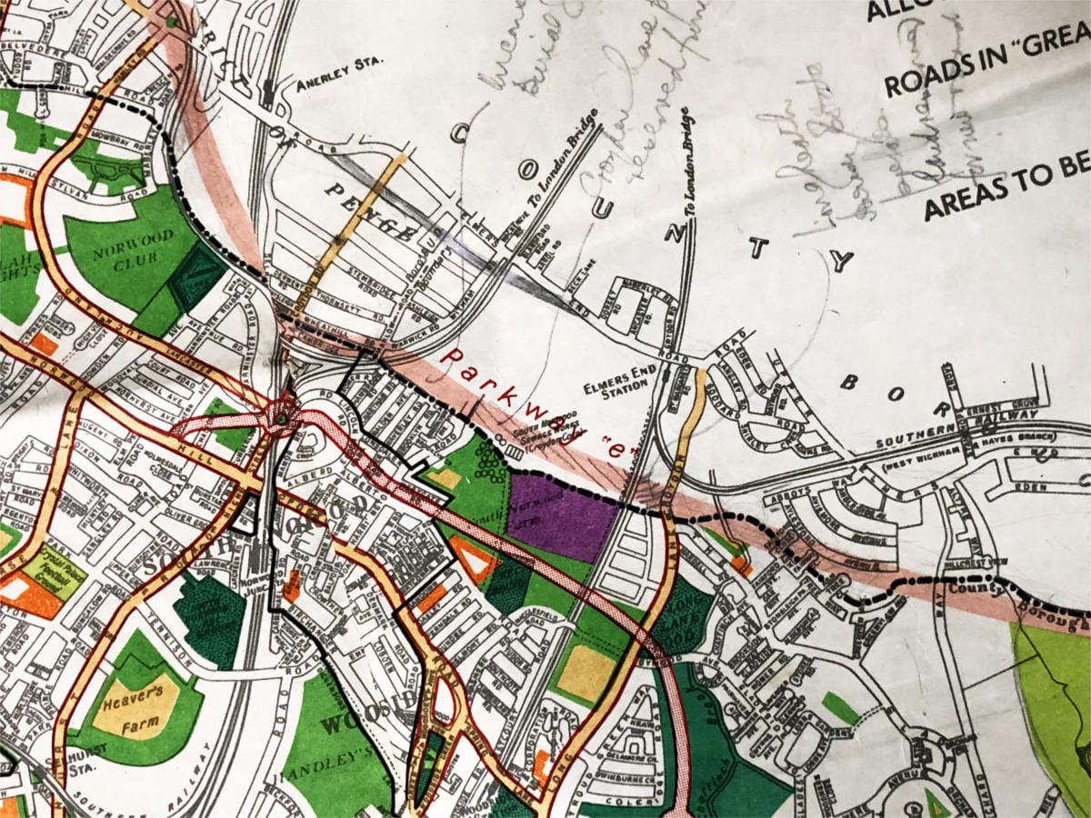 As with many of Abercrombie's grandest ideas, little progress was made on Parkway E when the war ended and rebuilding began. The Borough of Croydon was keen on it, and safeguarded its line from development by 1948. But the road ran along the borders of the Borough, so that only covered fragments of its route. Elsewhere not even that was done.
