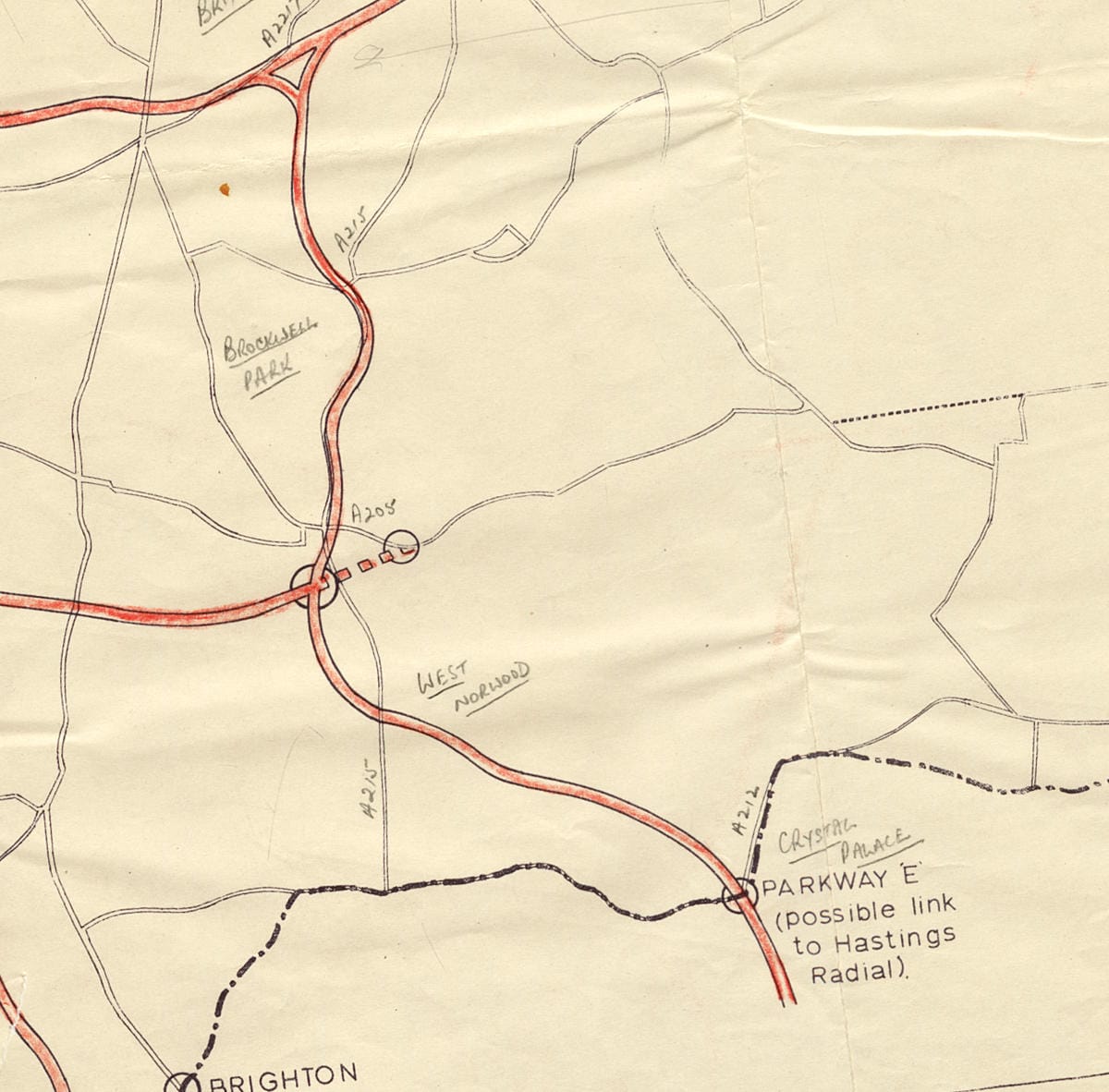 The idea was almost forgotten until the London County Council began tentatively sketching an urban motorway network for Inner London. Their early drafts included a handful of radiating arteries - including one called the "Hastings Radial". It struck out from the box of motorways surrounding Central London, passing through Tulse Hill and Crystal Palace on its way south. Parkway E was back in fashion.