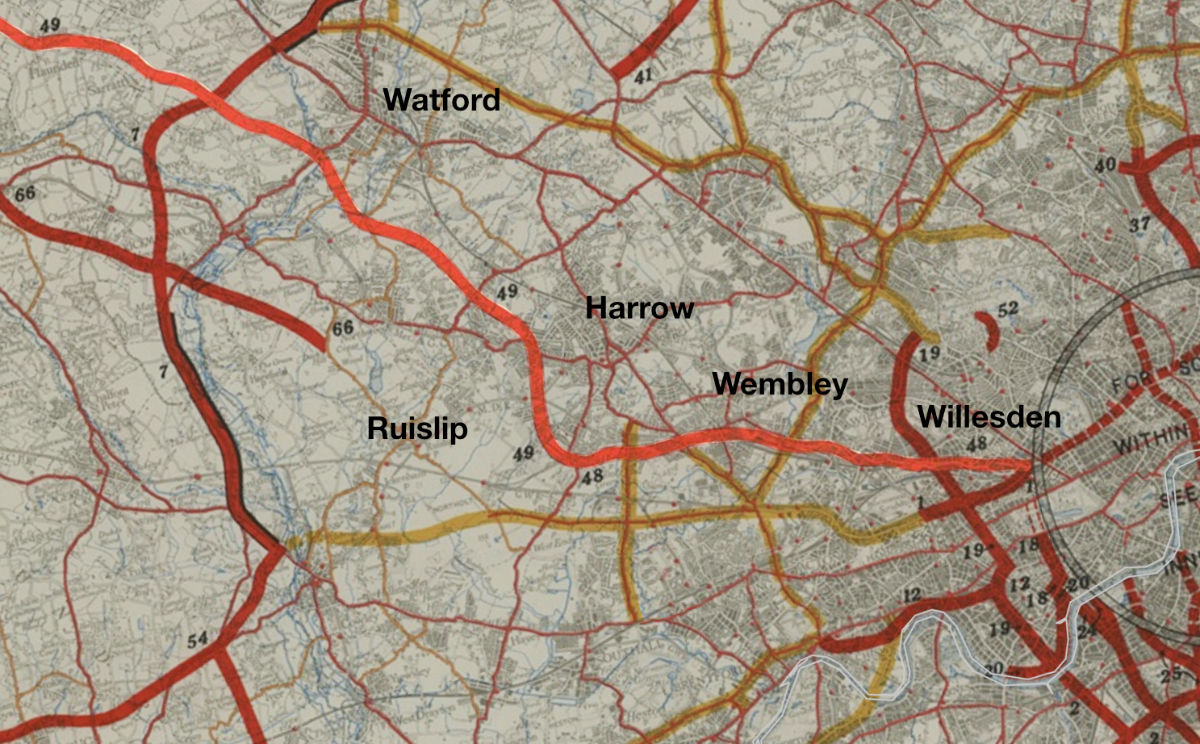 Plans to improve the A41 in north-west London and Hertfordshire go back a very long way, and most of them involved simply replacing it with a whole new road. In 1936, with the Watford By-Pass still brand new, Sir Charles Bressey recommended a new route linking the A41 at Watford to Central London, part of his ambitious Highway Plan. It would start at Marylebone, pass through Harrow and Pinner, skirt the western edge of Watford and strike out towards Tring.