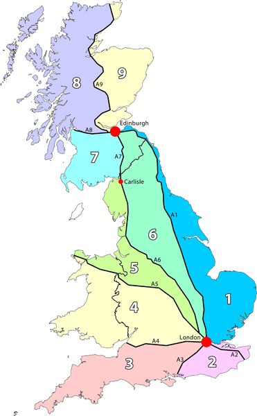 These single-digit A-roads radiate from London and Edinburgh, which can be referred to as the 'hubs' of the network. A1 to A6 radiate clockwise from London; A7 to A9 from Edinburgh. The two systems align in the Scottish Borders. Each zone takes its number from the single-digit A-road on its anticlockwise edge. The exception is in Kent where the boundary between zones 1 and 2 is the river Thames and not the A2. This is to prevent a small isolated section of zone 1 falling along the bank of the river. See also 2.4 What happens when a road crosses a zone boundary?.